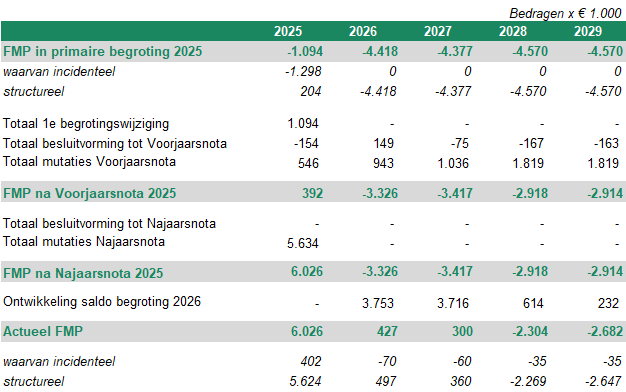 De Najaarsnota laat het volgende Financieel Meerjarenperspectief (FMP) zien. Zie onderstaande tabel. Vanaf 2026 is aansluiting gezocht bij de Programmabegroting 2026.